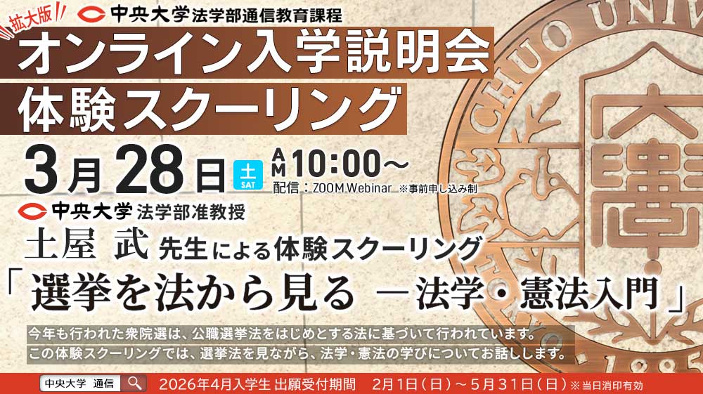 オンライン入学説明会【拡大版】では通常の説明会に加えて、中央大学法学部専任教員 土屋 武先生による模擬授業を開催いたします。