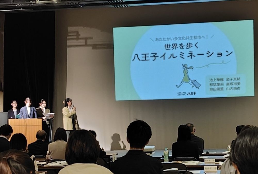 6名は、「世界を歩く八王子イルミネーション」と題して、八王子市を対象に、国籍や文化をこえて気軽に交流でき、誰もが「ここにいたい」と思える、あたたかい多文化共生都市とするためのアイデアを提案しました。