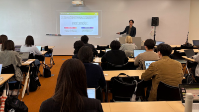 2026年4月27日の授業では、株式会社JTBより企画開発プロデュースセンターのデジタルマーケティング担当課長・及川秀昭氏、および同センターEarth Gift推進担当・坂本絢悠氏をゲストとしてお招きしました。講義では、同社のイノベーション戦略と新規事業開発の取り組みについてご講演いただきました。