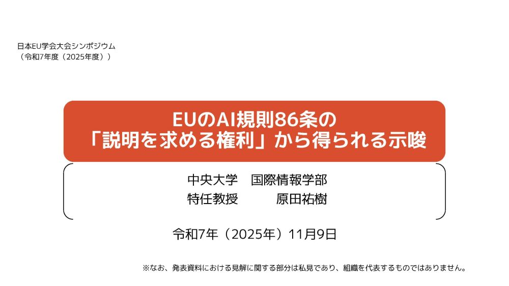 原田は公開シンポジウムにおいて、「EUのAI規則86条の「説明を求める権利」から得られる示唆」というタイトルで報告を行いました。