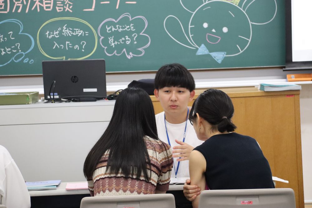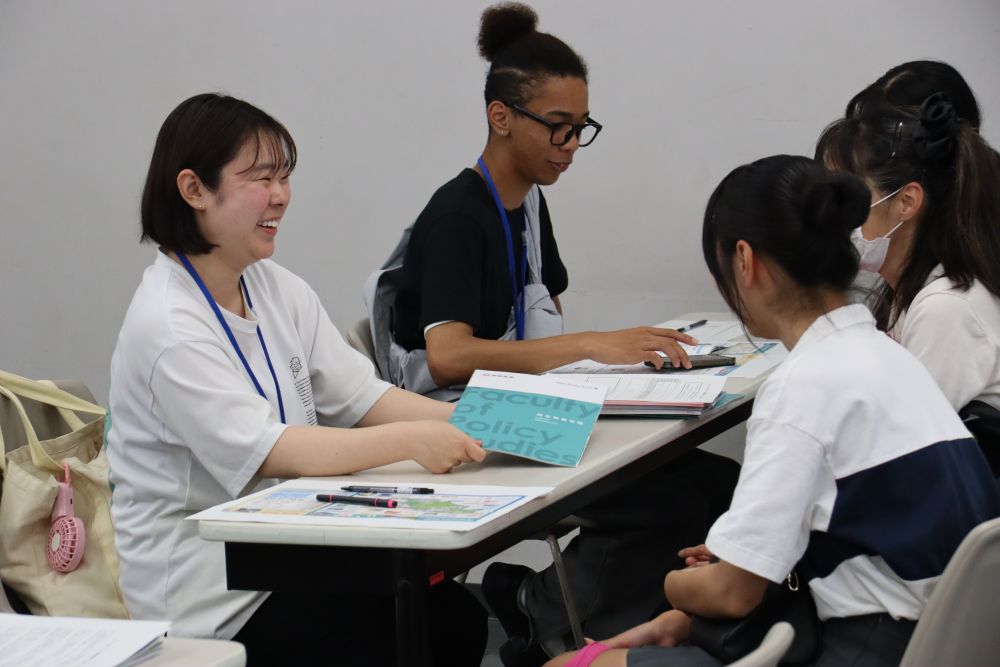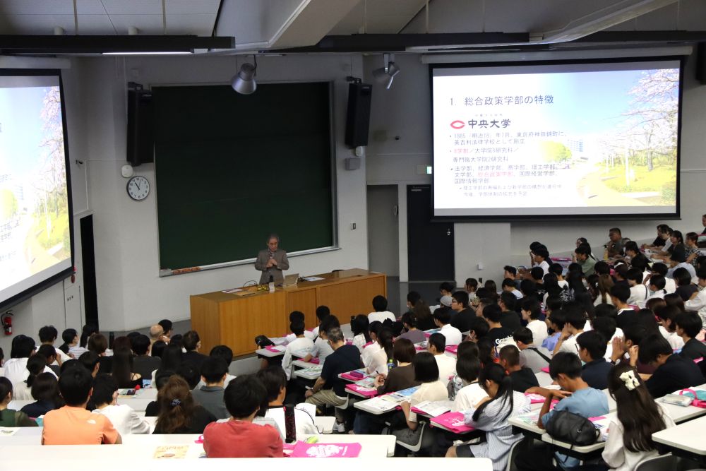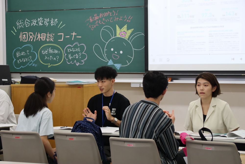 総合政策学部では学部ごとのイベントとして、総合政策学部教員による学部ガイダンス、模擬授業と、学生相談員による個別相談コーナーを開催し、ご来場いただいた方に、総合政策学部の学びについての紹介を行いました。