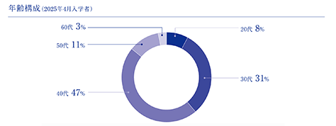 - 大半が経験豊かなビジネスパーソン:全体の平均年齢は、40~42歳程度です。CBSは、実務キャリアが10年程度ある、多様な業種での豊かな勤務経験がある人たちが集う場となっています。