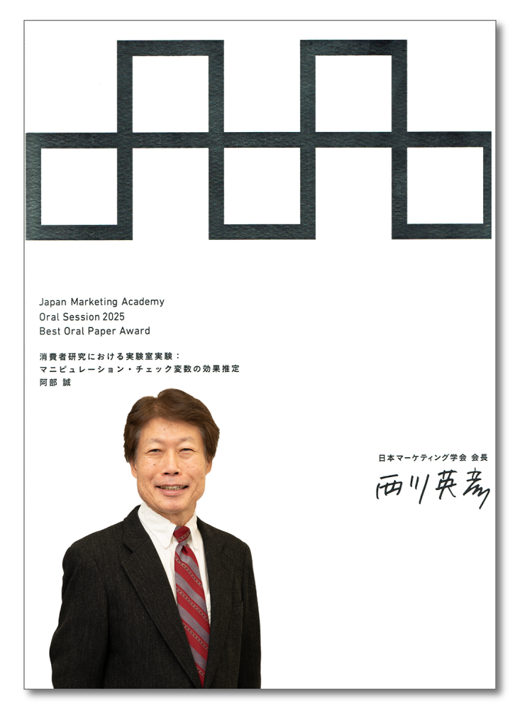 2025年10月に中央大学ビジネススクールの阿部誠教授が、日本で最大のマーケティング関連の学会(会員数、約3,300名)が開催する年1度の大会 『マーケティング・カンファレンス2025』 において、57のオーラルセッション報告の中からベストオーラルペーパー賞(理事会メンバーにより、ダブル・ブラインド査読の上、投票にて審査)を受賞しました。受賞論文は、学会誌「マーケティングレビュー」への掲載権利と連動しています。