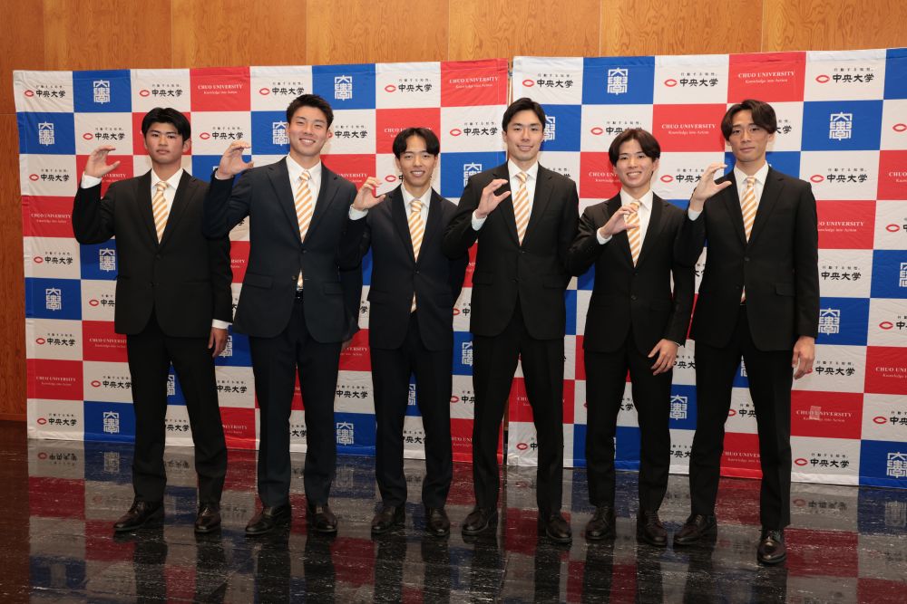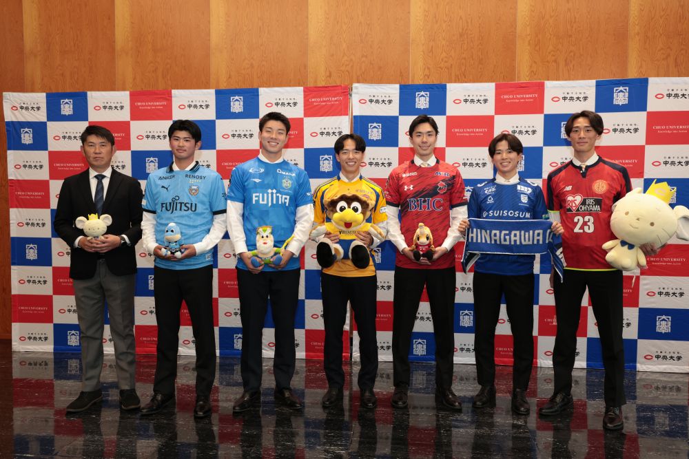2025年12月9日(火)13時より、本学FOREST GATEWAY CHUOホールにて、サッカー部の進路内定報告記者会見として、各チームに内定を得た6名が登壇し、今後の進路に向けた決意表明や写真撮影を行いました。