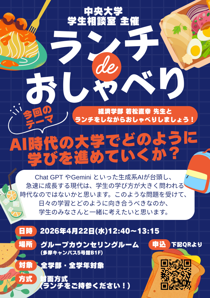 ランチ de おしゃべり第1弾(経済学部 若松 直幸 先生)『AI時代の大学でどのように学びを進めていくのか?』実施のお知らせ(学生相談室主催イベント)
