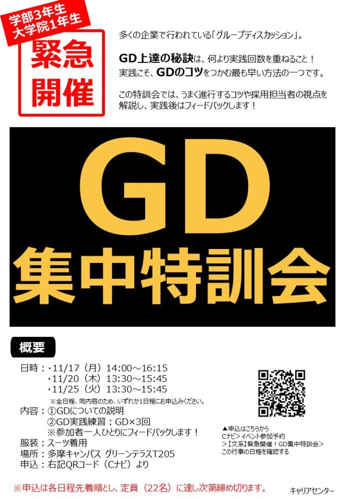 Cナビ:https://www2.kyujin-navi.com/GAKUGAI/login/saml/sso/gakuninCナビ>イベント参加予約>【文系】緊急開催!GD集中特訓会>この行事の日程を確認する