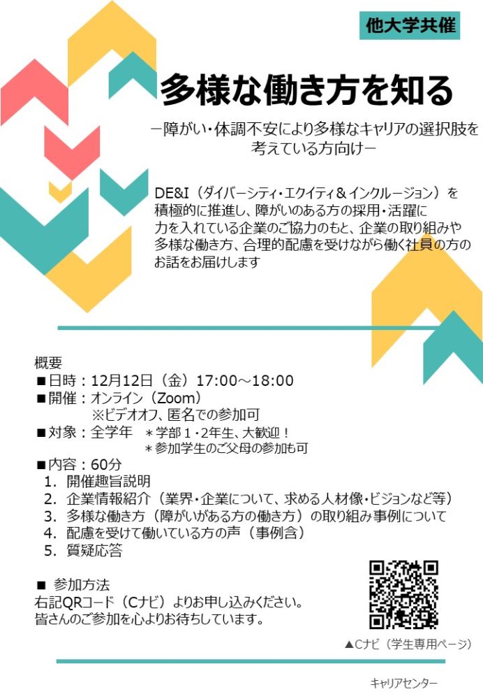 (全学年対象)他大学共催「多様な働き方を知る- 障がい・体調不安により多様なキャリアの選択肢を考えている方向け-」