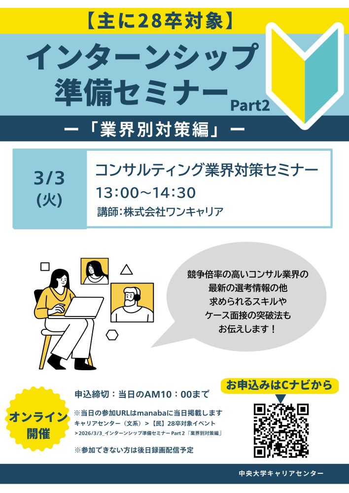 キャリアセンター(文系)>【民】28卒対象イベント>2026/3/3_インターンシップ準備セミナー Part2「業界別対策編」コンサルティング業界対策セミナー