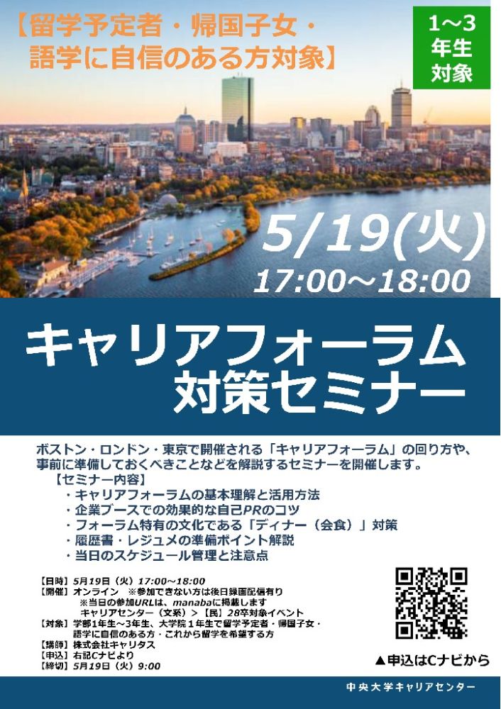 【学部1年生~3年生、大学院1年生対象】「キャリアフォーラム対策セミナー」開催のお知らせ