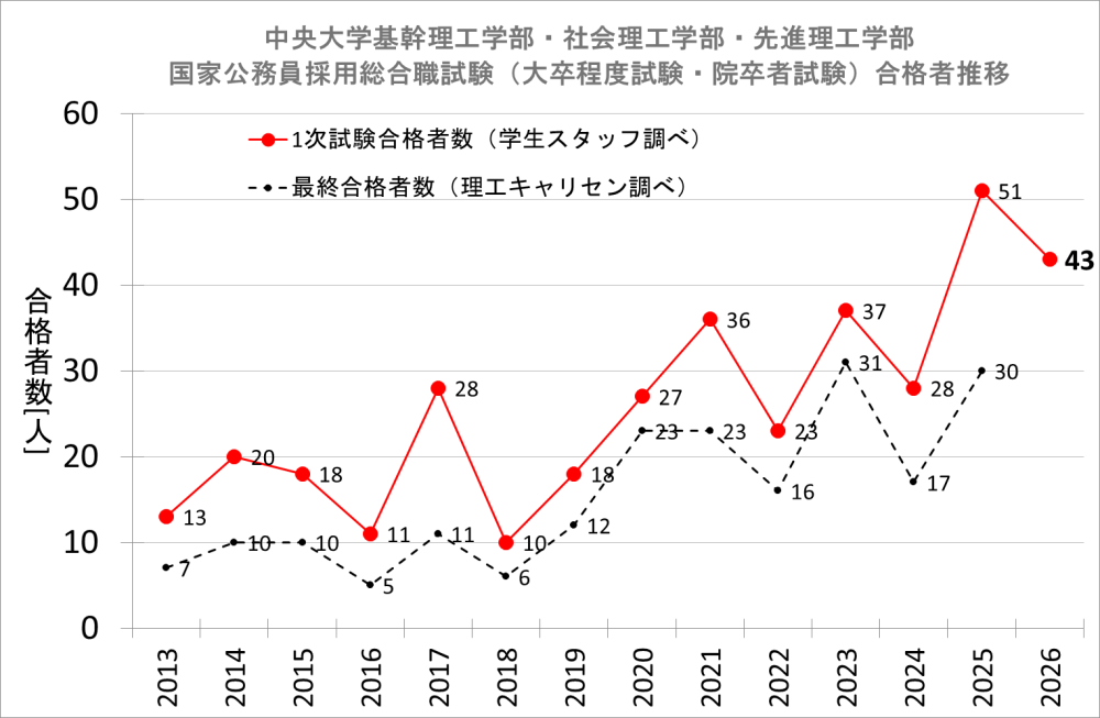 例年多数の学生が合格している本学理工学部・理工学研究科ですが、今年は、現段階で把握している合格者数が43名であり、極めて高い合格率となっています(中央大学調べ:4月16日現在までの報告に基づく)。