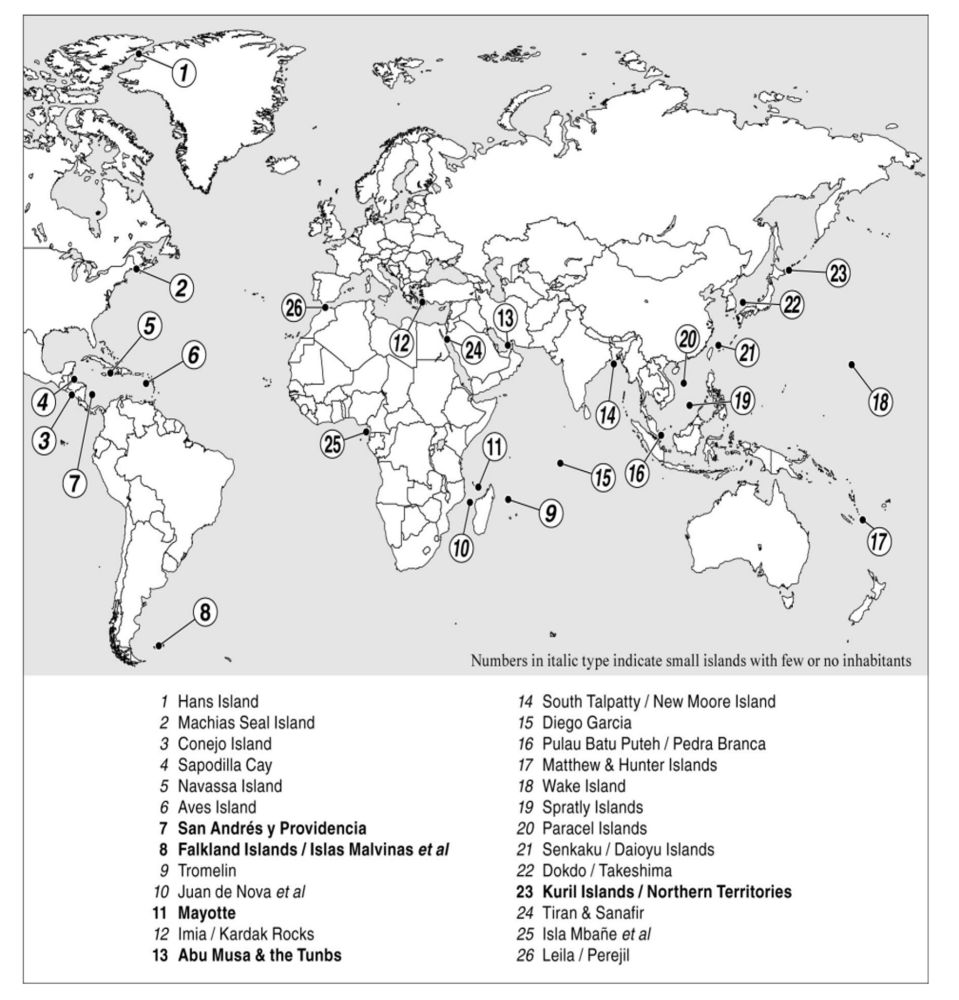 Figure 2: Territorial disputes of islands throughout the world Source: Martin Pratt, "The Scholar-Practitioner Interface in Boundary Studies," Eurasia Border Review, Volume 1, No. 1, 2010, p. 35.