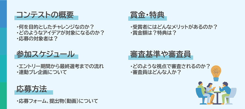 コンテストの概要、スケジュール、応募方法、賞金などについて、担当者が丁寧に説明します。