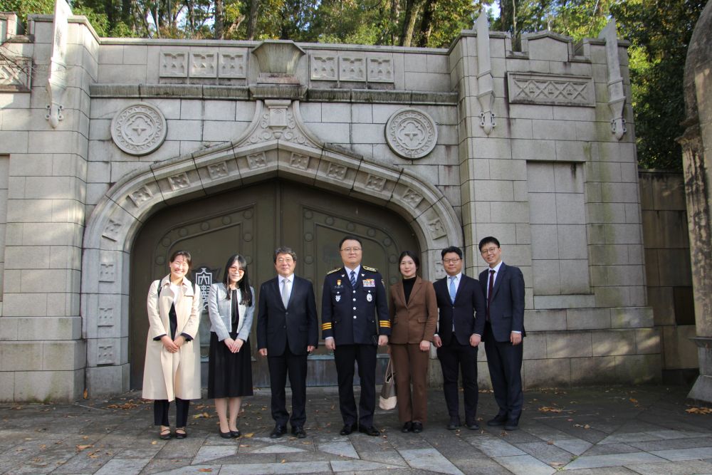 御一行は本学へのご到着後キャンパスをご見学され、大学史資料館・法と正義の博物館、学生食堂、国際教育寮などを内覧されたほか、100周年記念ステージとして復元された本学の象徴である白門、および、その傍らに韓国留学生卒業生によって建立された白門無窮の碑などをご覧になりました。
