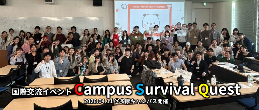 2026年4月11日(土)、多摩キャンパスにて国際交流イベント「Campus Survival Quest」が開催されました。「Campus Survival Quest」は交換留学生が来日直後に抱えるであろう様々な不安を解消し、国内生と留学生との交流を促進し、長期間にわたる交友関係の構築を目的としたイベントです。実際に留学生として海外に住んだ経験のあるメンバーや、イベントのビジョンに共感するメンバーによって立ち上げられました。当日は、留学生、国内学生、運営学生スタッフ合わせて80名以上もの学生が参加し、大変盛り上がるイベントとなりました。