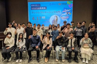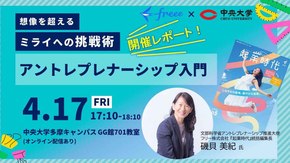 2026年4月17日(金)、中央大学のアントレプレナーシップ教育推進の一環として、アントレプレナーシップ入門「想像を超えるミライへの挑戦術」を多摩キャンパス グローバル館7階ホールにて開催しました。本イベントでは、文部科学省アントレプレナーシップ推進大使・フリー株式会社 編集長の磯貝美紀氏を講師としてお迎えしました。アントレの定義や考え方、身近な行動とのつながり、そして学生だからこそ広がる可能性まで、これから挑戦したい学生にとっての“最初の一歩”となる講義でした。