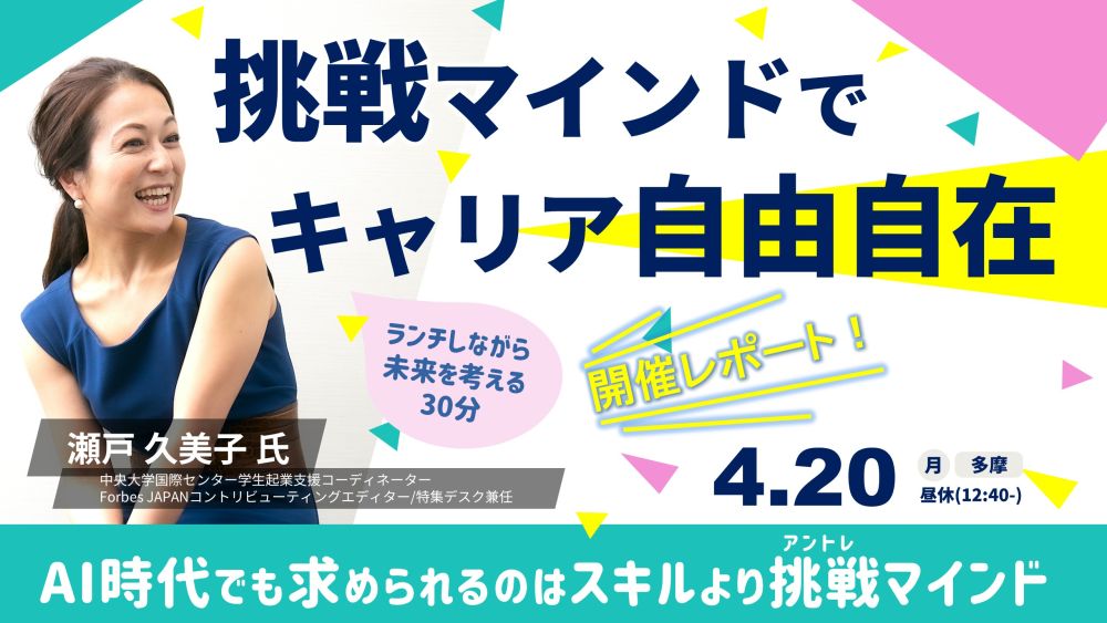 2026年4月20日(月)多摩キャンパス Gスクエアにて 学生起業支援コーディネーターの瀬戸久美子氏による「ランチしながら未来を考える30分 ー挑戦マインドでキャリア自由自在!ー」を開催しました。