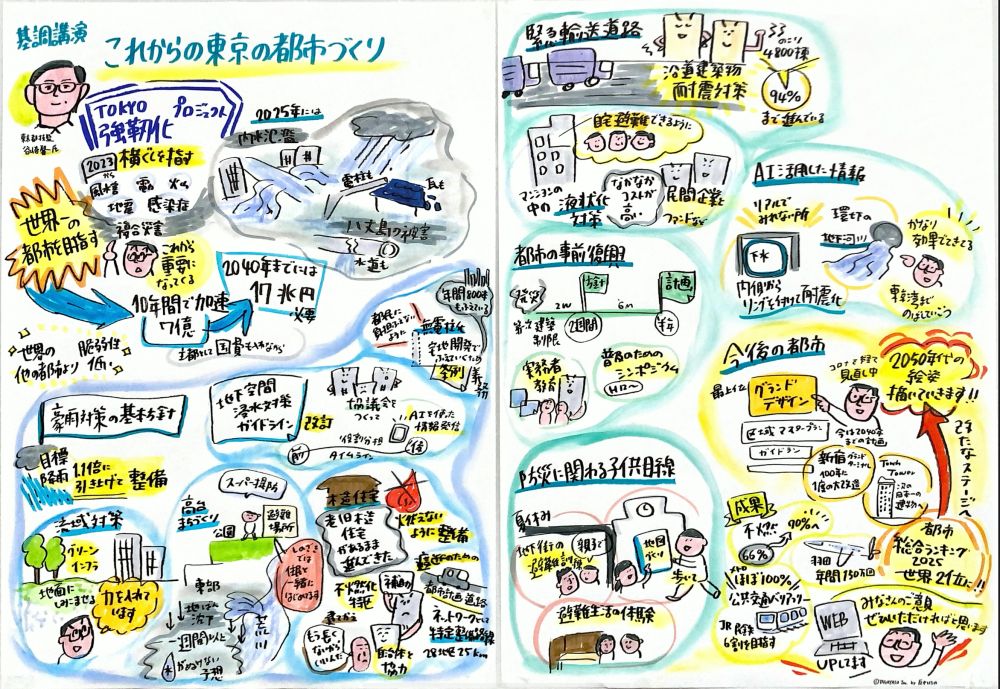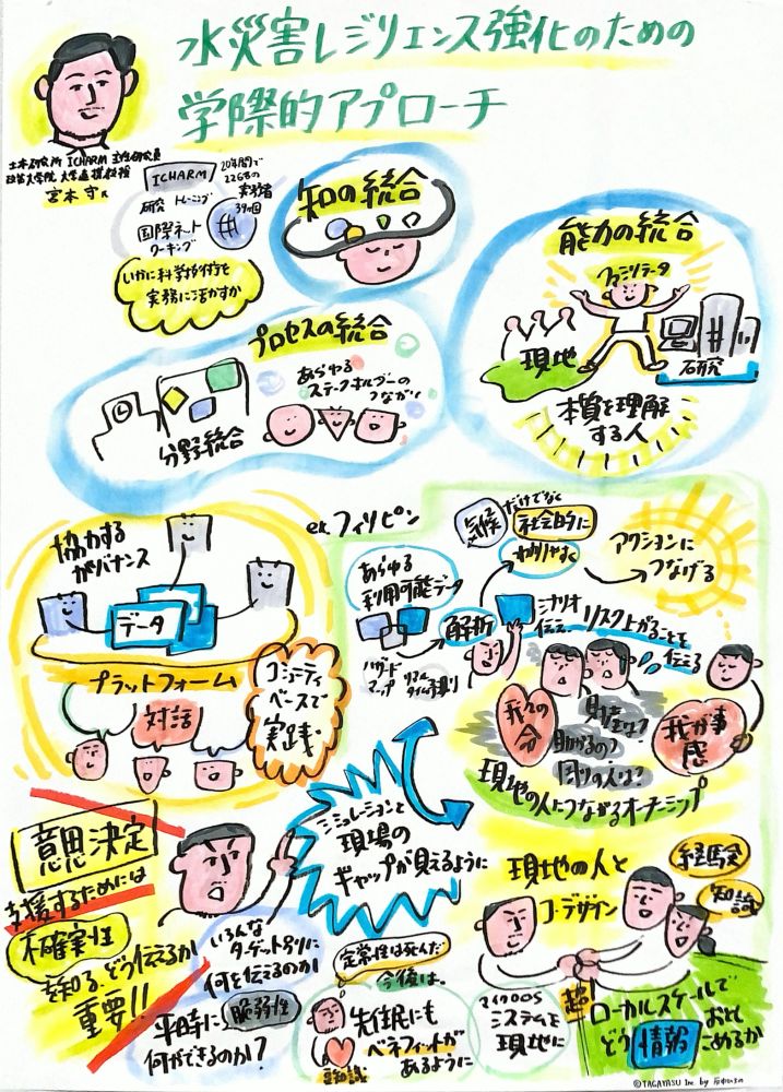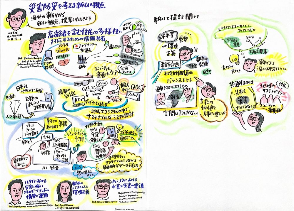なお、設立シンポジウムに引き続き、本シンポジウムにおいてもビジュアルプラティクショナーの反中 ひろの様(株式会社たがやす)によって、各発表者からの講演内容のグラフィックレコーディングが行われました。