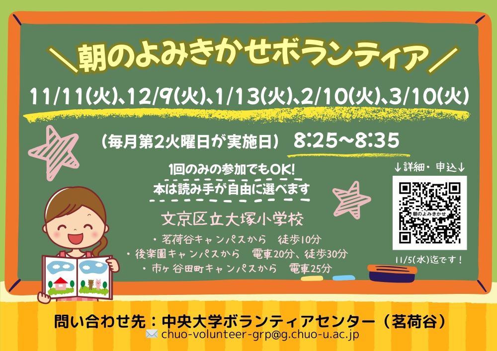 【ボランティア募集】文京区立大塚小学校にて、小学生に 朝のよみきかせ(11月,12月,1月,2月,3月の第2火曜)
