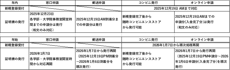 冬季休業期間は、各種証明書の発行業務及び証明書コンビニ発行サービス・証明書オンライン申請サービスの新規登録受付処理を行いませんのでご注意ください。なお、英文証明書や学力に関する証明書(教職)、その他の特殊証明書については、この扱いとは異なり、申請受付後、発行までに1週間以上かかる場合もございますので、余裕をもって申請いただきますようお願いいたします。