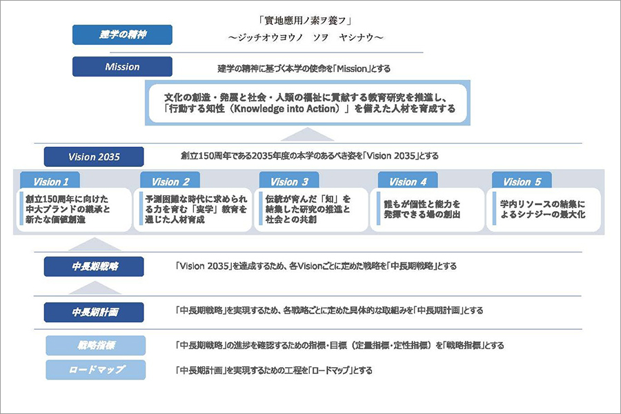 学校法人中央大学は、創立150周年を迎える2035年に向け、中長期事業計画「Chuo Vision 2035」を策定しました。2016年から2025年までの10年間に取り組んできた中長期事業計画「Chuo Vision 2025」の成果と実績を踏まえ、本計画では、時代の変化に的確に対応しつつ、本学のさらなる発展に向けて、新学部の創設や都心キャンパスの一層の集約化、組織構造の変革など、次なる展開を推進してまいります。