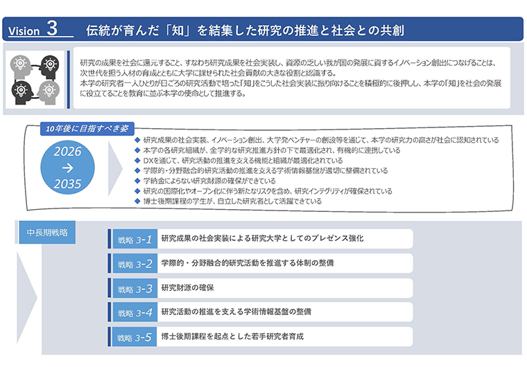 本学の研究者一人ひとりが日ごろの研究活動で培った「知」をこうした社会実装に振り向けることを積極的に後押しし、本学の「知」を社会の発展に役立てることを教育に並ぶ本学の使命として推進する。