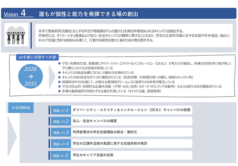 本学で教育研究活動をともにする学生や教職員の「心の豊かさ」を育む多様性あふれるキャンパスを創出する。