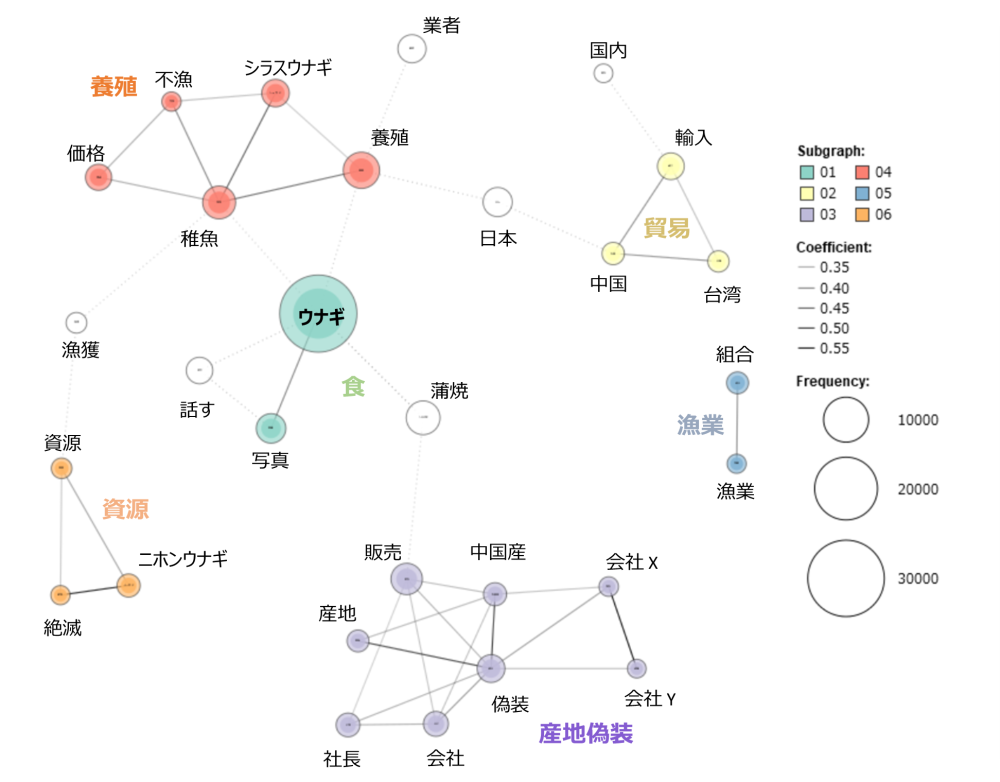 ・過去30年間に主要全国紙4紙に掲載された「ウナギ」に関する記事(8,387本)を抽出し、テキストマイニングと統計学的手法で分析した