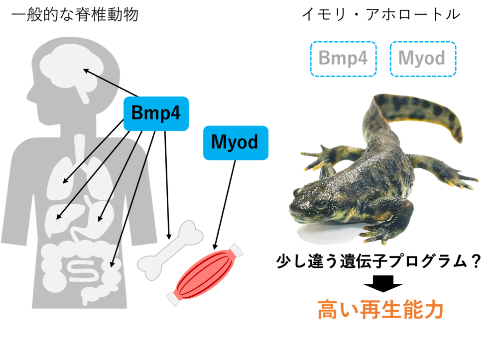 脊椎動物の体の形作りに欠かせない形態形成遺伝子#7のいくつかが、有尾両生類において失われている可能性が高いこともわかりました。Bmp4(骨形成因子4)は脳、眼、内臓、歯や骨など動物の幅広い組織や器官の形成に重要な遺伝子ですが、イモリやアホロートルでは失われている可能性がわかりました。また、MyoD遺伝子は筋肉の形成に重要であり、ヒトを含む他の脊椎動物には必ず存在しています。イモリやアホロートルにも筋肉がありますが、Bmp4と同様にMyoD遺伝子も失われている可能性が高いことが明らかになりました。このことから、進化の過程で他の脊椎動物とは少し違った形態形成遺伝子プログラムを持つようになり、それが高い再生能力にも関連しているのかもしれません。