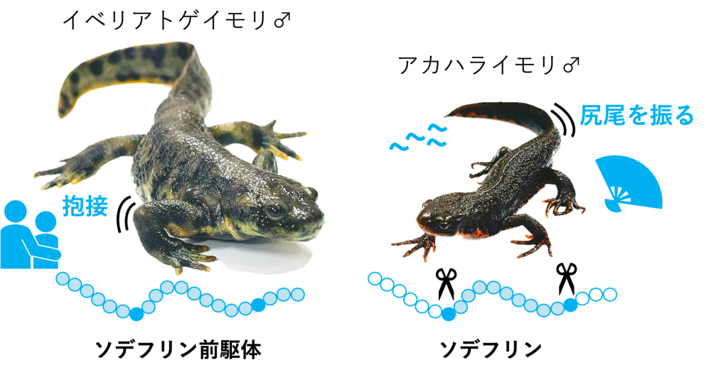 アカハライモリから発見されたメス誘引フェロモンであるソデフリン#8は、前駆体が切断されて10アミノ酸ほどの短いタンパク質(ペプチド)として機能します。今回の研究でイベリアトゲイモリにおいては前駆体が切断されず、そのままでフェロモンとして機能している可能性が示唆されました。このことはアカハライモリのオスは尻尾を振ってフェロモンを遠くに拡散させてメスを呼び込むのに対し、イベリアトゲイモリのオスはメスを羽交締めするという、繁殖行動の違いに深く関連しているようです。