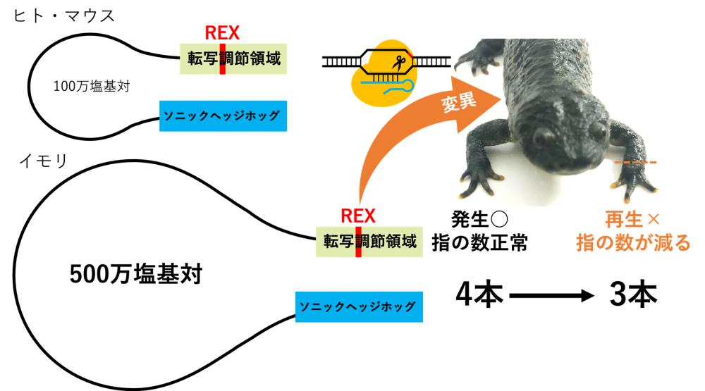 四肢(手足)形成に重要なソニックヘッジホッグ遺伝子(Shh)の転写調節領域(エンハンサー)#9は他の脊椎動物では100万塩基対も遠く離れて機能していることが知られています。有尾両生類ではゲノムの巨大化によってShh遺伝子とエンハンサー間が約500万塩基対も離れているにもかかわらず、正常に機能して四肢が作られることが証明されました。また、この超長距離間で遺伝子発現を正確にオンにするための特殊な配列が存在します。イベリアトゲイモリにおいてゲノム編集#10を用いてこの配列の一つに変異を入れると、四肢発生は正常であるが四肢再生には異常が現れることが判明しました。これは、この配列が再生にも関与している可能性があることを示唆しています。