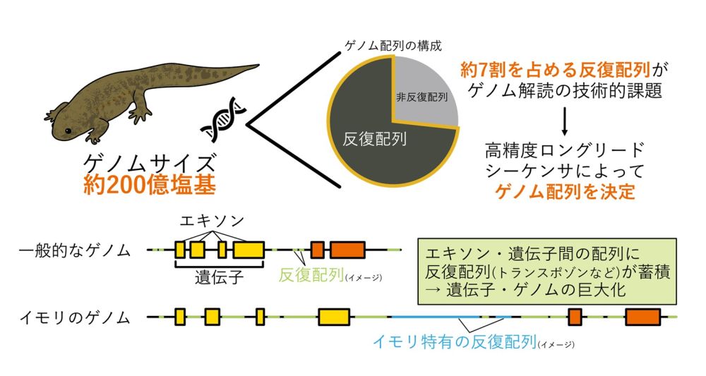 有尾両生類であるイモリは、古くから発生や再生の研究において重要な役割を果たしてきました。しかしイモリのゲノムは、反復配列によりヒトの数倍から十数倍と巨大であるため、長らく決定が困難でした。今回、主に国内の研究者からなる「イベリアトゲイモリ研究コンソーシアム」を中心として、日本で樹立された近交系統イベリアトゲイモリ#1を対象に最新の高精度ロングリードシークエンス技術を用いてゲノム解読に成功しました。そのゲノムは約200億塩基対に達し、ヒトの約7倍もの大きさです。解析の結果、ゲノム巨大化に関わる反復配列、器官再生における遺伝子発現制御、両生類の進化やイモリ特有の生殖行動に関わる遺伝子の特徴などが明らかになりました。本研究の成果は、イモリが持つ様々でユニークな生命現象の謎に迫るための重要な情報として、生物学の分野において幅広い展開が期待されます。本研究成果は、2025年9月9日に米国学術雑誌 iScience のオンライン先行版に掲載されました。