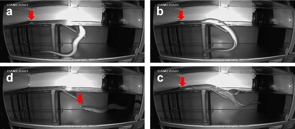 図1:陸上でコオロギを捕食するウナギ(オオウナギ)(a-dの順)。行動実験を行なった10個体全てで陸上での捕食を観察した。