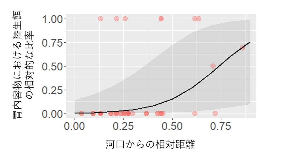 図2:胃内容物における陸生餌と水生餌の比率と、河口からの相対距離との関係。横軸にウナギの採集地点の河口からの相対距離、縦軸に胃内容物に占める陸生の餌の割合を示す。グレーの網掛けは90%信頼区間を示す。