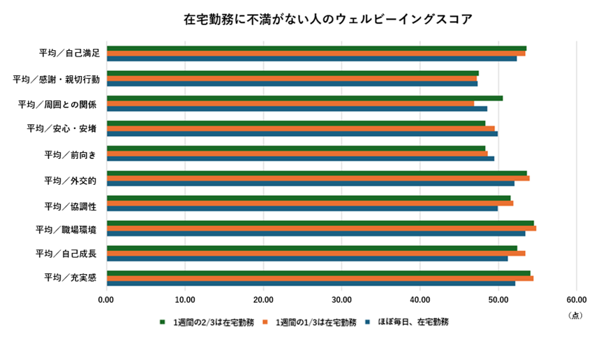 ・在宅勤務者や一部在宅勤務者は、毎日オフィスに出勤する者に比べて、充実感・自己満足のスコアが高い結果となりました。
