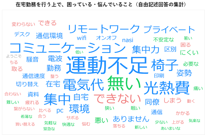 ・在宅勤務の課題として、光熱費・電気代の負担やコミュニケーション・人間関係のストレスが挙げられました。