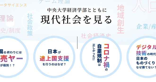 この度、新体制での学びをより具体的にお伝えするため、「経済学部学科再編特設サイト」(https://economics.v.chuo-u.ac.jp/)において、現代社会を経済学で読み解くコラムや、教員が学びの意義を語る対談など、新たなコンテンツを公開しました。学生がどのように考え、どのように社会課題に向き合う力を身につけるのかを紹介する内容となっています。