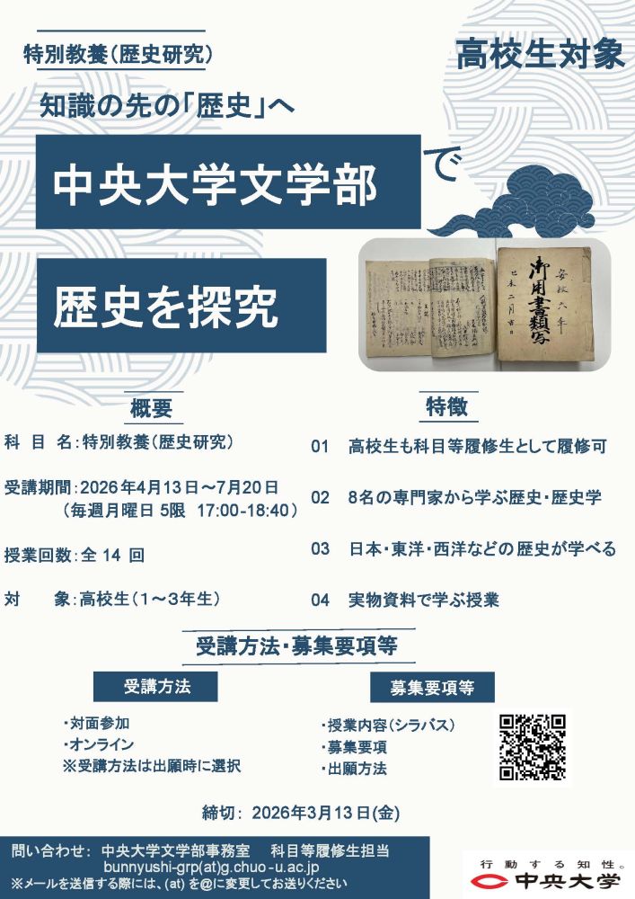 中央大学文学部(所在地:東京都八王子市)は、2026年度より科目等履修生制度に全国の高校生を対象とした新講義「特別教養(歴史研究)」を開設いたします。本講義は、高校生が大学の学びを体験し、将来の学部選択に役立ててもらうことを目的としています。2026年度前期授業への出願は、1月30日(金)より受け付けております。