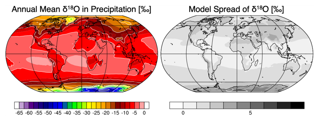8つの水同位体気候モデルによる降水中の酸素同位体比(δ18O;左)とそのばらつき(右)