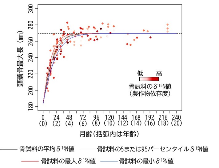 プロットは各個体のデータを示し、赤色が濃いほどδ15N値(農作物依存度)が高いことを示す。水平の点線は最良モデルを基に推定された頭蓋骨の最大サイズを示す。実線は色別に上記凡例の値を用いたときの予測成長曲線であり、赤線は農作物依存度が最も高い場合、青線は最も低い場合を示す。なお、月齢については切歯のセメント質年輪法により推定した年齢に基づき算出した。