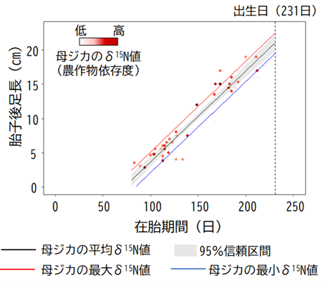 プロットは各胎子のデータを示し、赤色が濃いほど当該胎子の母ジカ骨試料のδ15N値(農作物依存度)が高いことを示す。垂直の点線はニホンジカの平均出生日(231日)を示す。実線は色別に上記凡例の値を用いたときの胎子の予測成長式であり、赤線は母ジカの農作物依存度が最も高い場合、青線は最も低い場合である。