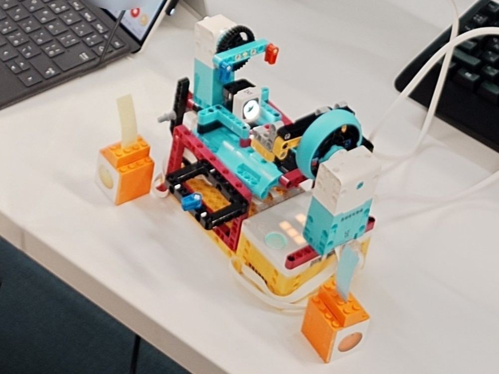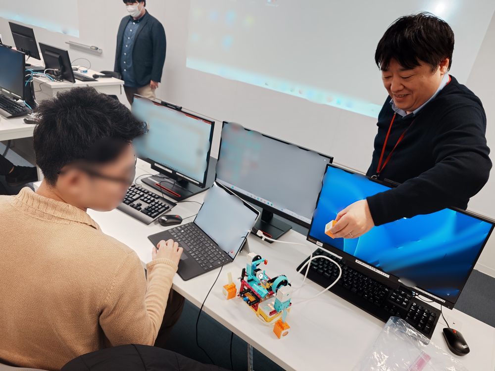 当該授業はロボットプログラミングキット(LEGO Spike)を用いて、汎用のプログラミング環境としてPythonを扱い、ロボットを操作します。ロボットが測定した数値を利用して、データサイエンスの基本を学びます。当日はプログラミングおよび測定方法の設計・実践を経た成果発表でした。