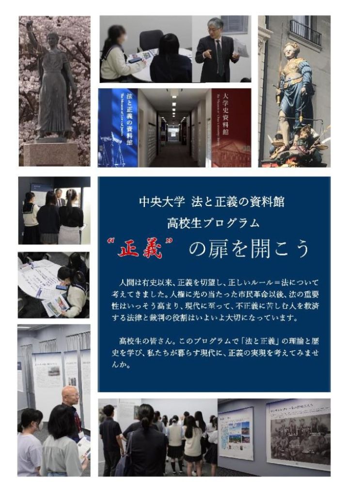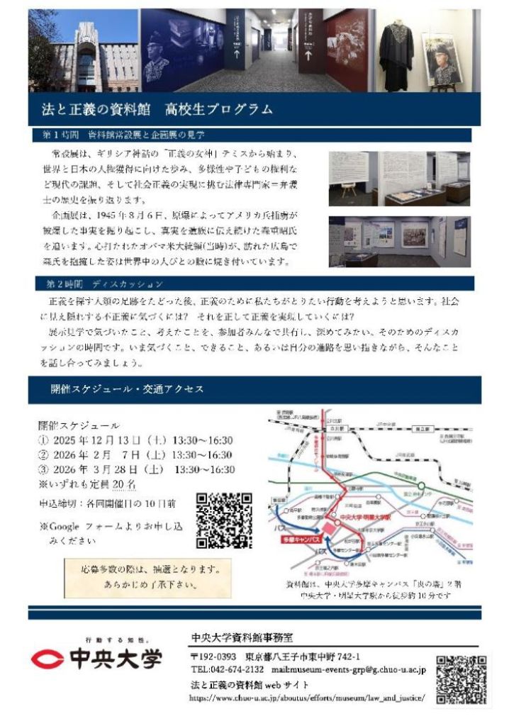中央大学法と正義の資料館では【高校生プログラム】を、昨年12月、本年2月に開催しました。おかげ様で多数の参加希望がありましたので、今年度も引き続き開催を予定しています。