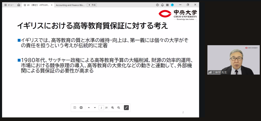講演は、「イギリスの高等教育質保証の変遷から学ぶわが国の認証評価の方向性」と題し、イギリスが経験してきた機関別評価と分野別評価の事例報告と最近の評価の動向について情報提供が行われました。