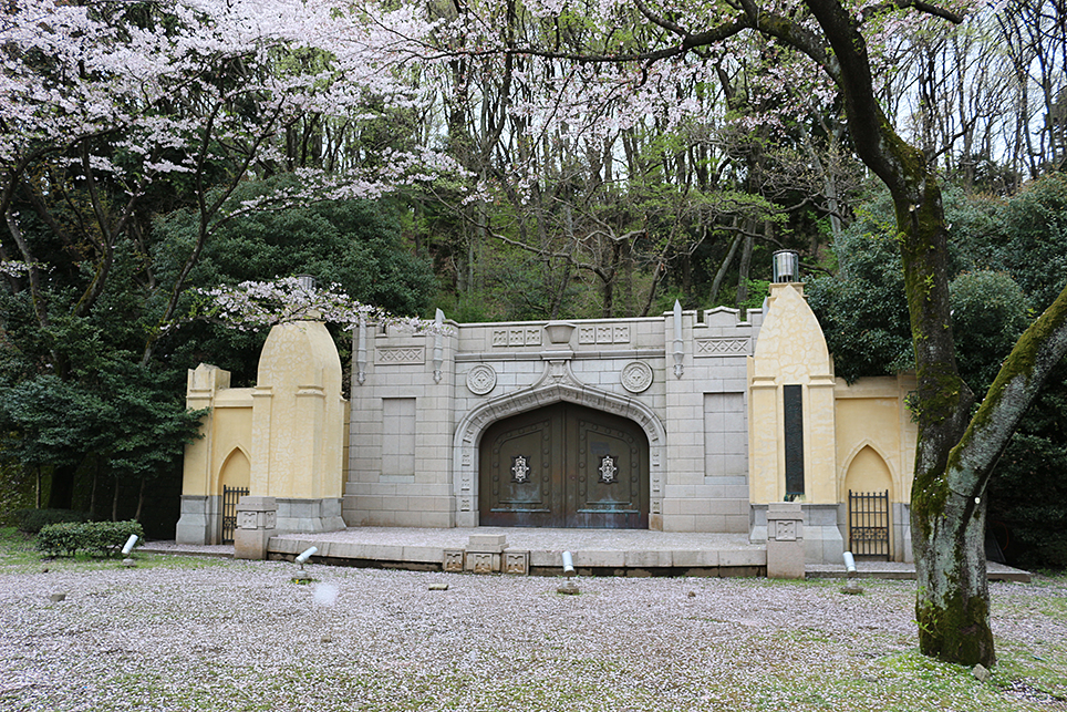 多摩キャンパス移転後の1985年、桜広場に創立100周年記念のオブジェが建設されます。駿河台校舎の歴史を伝える建材を使用したもので、南門、大学門標(近藤雪竹書写)、2号館玄関部分、講堂玄関ホール床模様、図書館玄関階段親柱、南門廻り鋪石が移築されました。これが、現在の撮影スポットとして人気を集める「創立100周年記念ステージ」です。