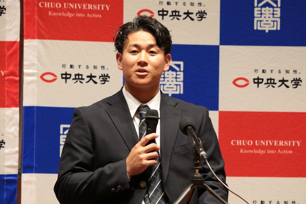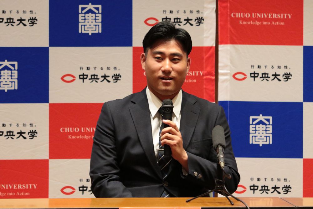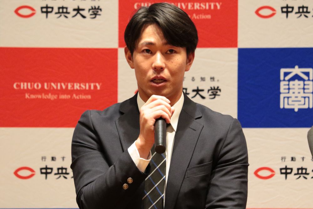 中央大学多摩キャンパスで樫山和男部長、清水達也監督と記者会見に臨みました。岩城颯空選手は「早く一軍で投げ、チームに貢献したい」、繁永晟選手は 「選ばれたからには、楽天の一員としてチームを優勝へ導く」、皆川岳飛選手選手は 「ここがゴールではなくスタート、プロになっても己惚れることなくしっかり頑張る」、とそれぞれ抱負を述べました。