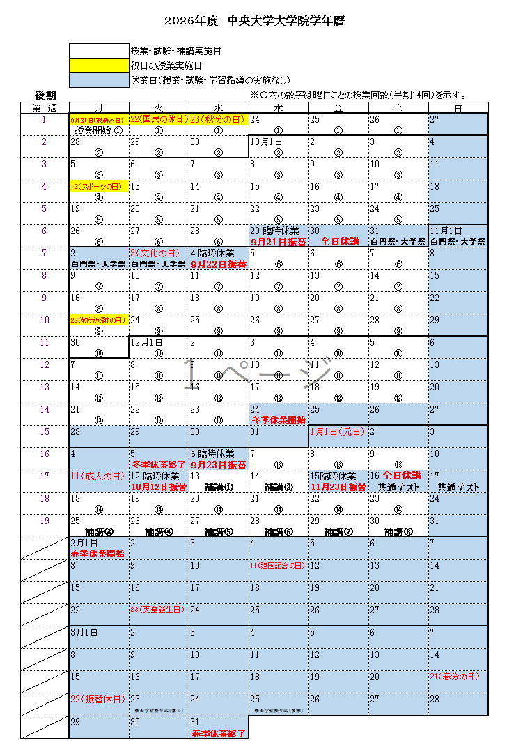 - 白門祭・大学祭の準備・実施期間を10月30日(金)~11月3日(火)とし、当該期間は全研究科において、全日休講とします。