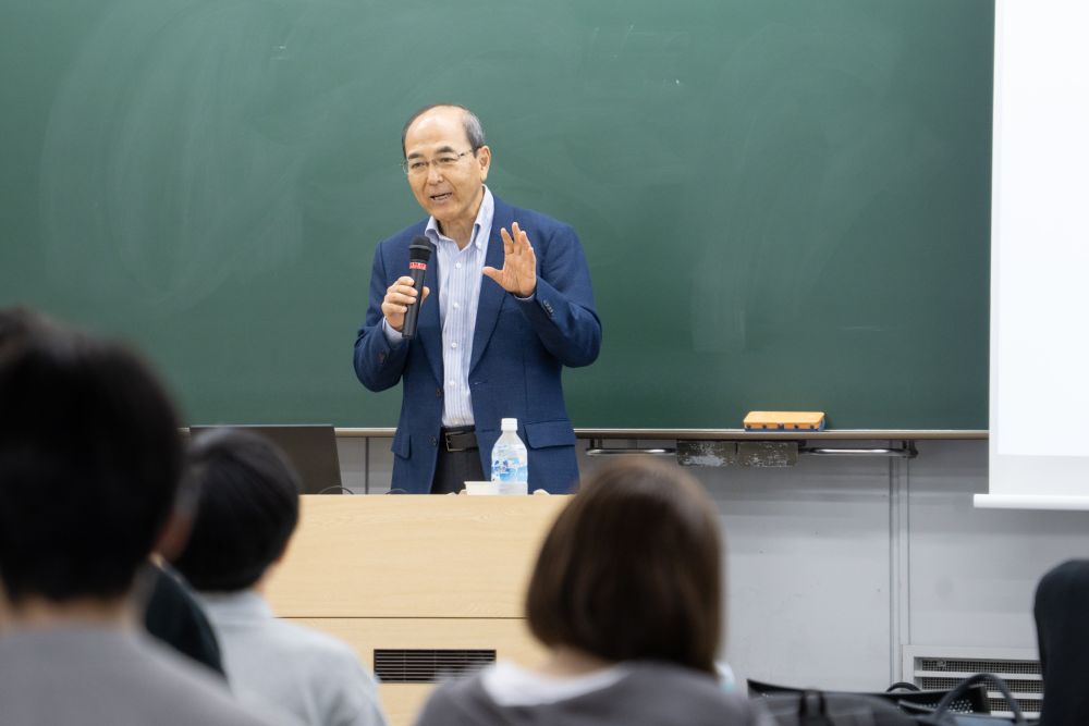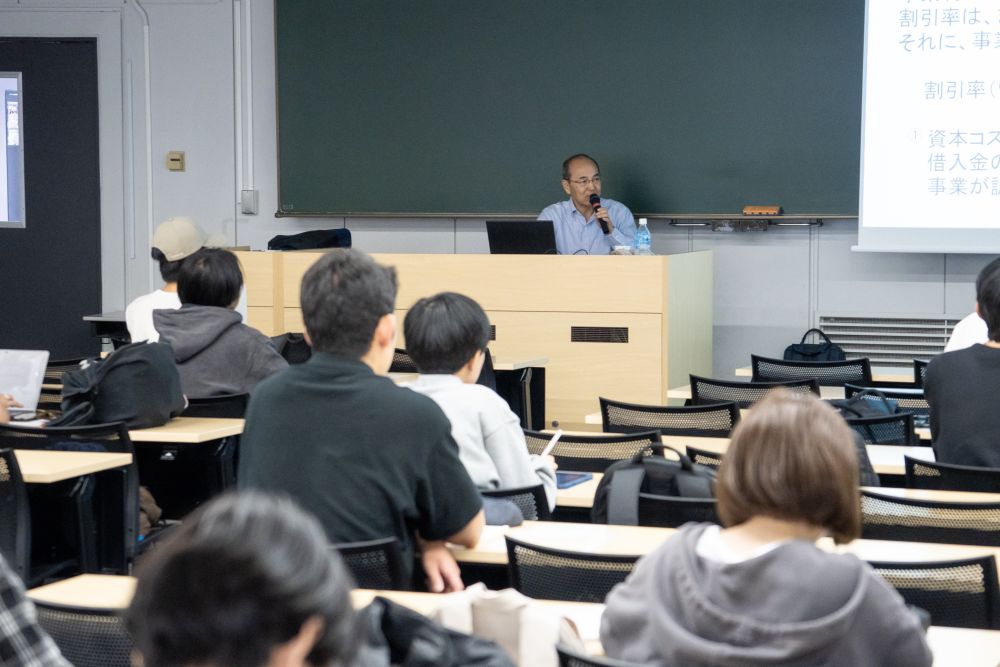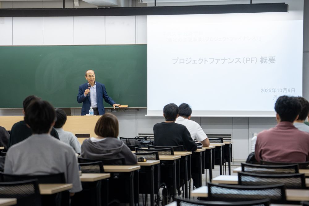 2025年10月9日、経済学部「金融論Ⅰ(担当教員:近廣昌志)」の授業内で、プロジェクトファイナンス(PF)をテーマとした特別講義が行われました。講師を務めてくださったのは、元三菱商事の丹田 雅敏さまです。 本講義はPFの基本的な仕組みから実際の活用例を細かに解説くださるものでしたが、冒頭で講義の目的・ポイント・キーワードが明示され、話の全体像がつかみやすい構成でした。