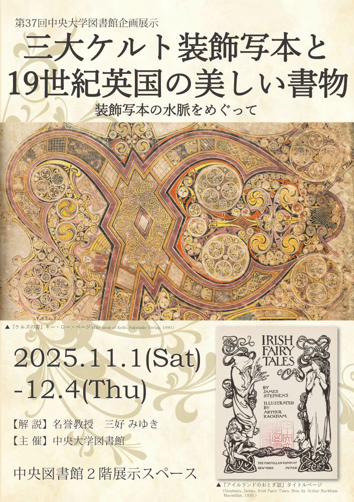 中央図書館では年に2回企画展を行っており、2025年度後期には11月1日(土)から12月4日(木)まで、「三大ケルト装飾写本と19世紀英国の美しい書物」という企画展が、三好みゆき(本学名誉教授)監修のもとで開催中です。