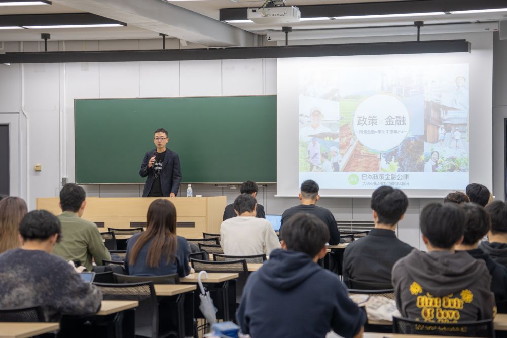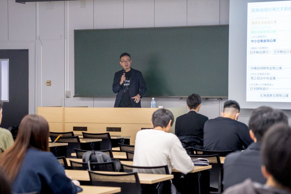 2025年10月20日、経済学部の科目「金融論Ⅰ(担当教員:近廣 昌志)」において日本政策金融公庫の河本さまと山田さまをお招きし、「政策×金融~政策金融が果たす使命とは~」と題された特別講義が開催されました。先に登壇された河本さまは本学商学部の卒業生で、近廣先生とゼミの同期だったというご縁です。
