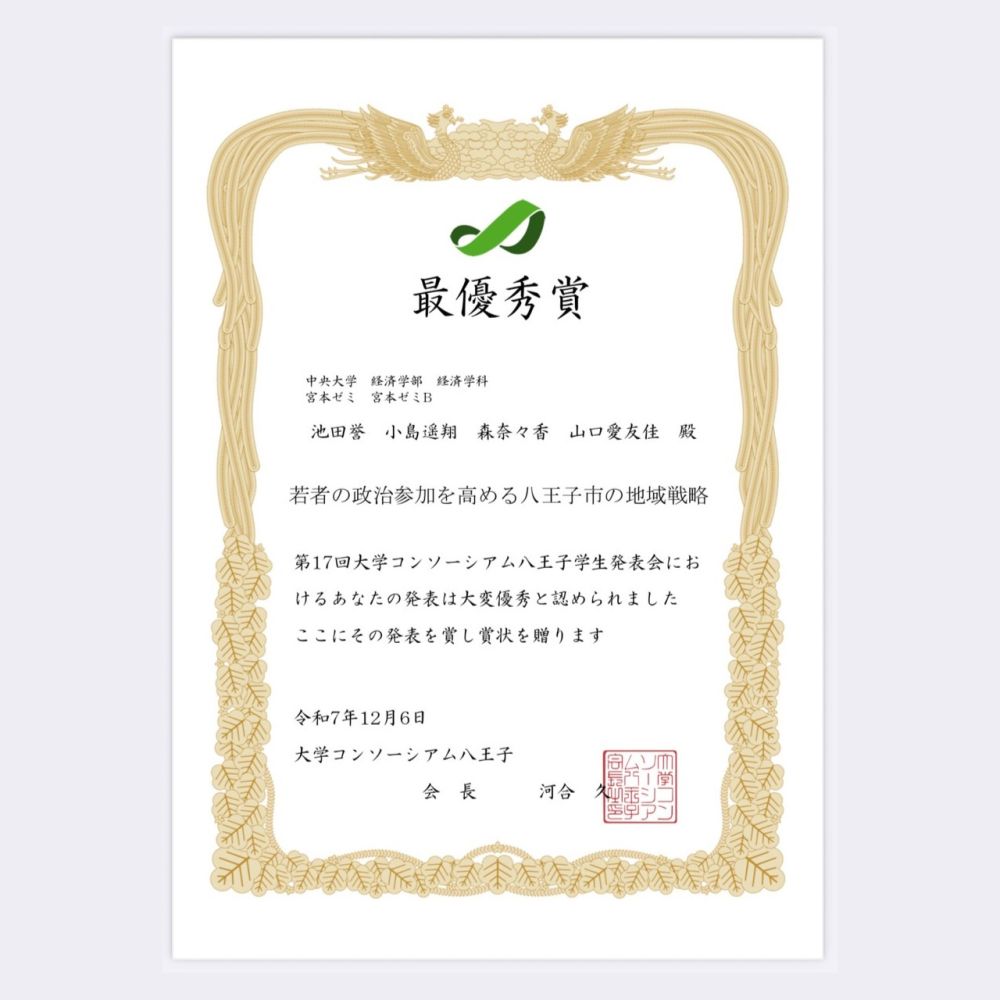 このイベントに参加したチーム《宮本ゼミB》は、「若者の政治参加を高める八王子市の地域戦略」を提案し、「最優秀賞」を獲得しました。